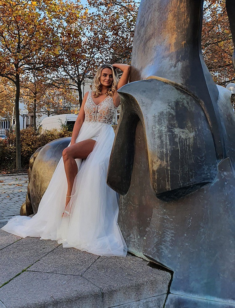 Das Kleid aus dem Shooting ist ein echter Hingucker: Ein leicht glitzerndes Oberteil mit tiefem V-Ausschnitt trifft auf einen transparenten Beinschlitz im Tüllrock. Sexy, aber niemals aufdringlich. Dazu ein lockeres Lächeln, offene Haare und Sonnenlicht auf der Haut – genau das zeigt, was moderne Brautmode Empire Stil ausmacht: Weiblichkeit, Selbstbewusstsein und Leichtigkeit.