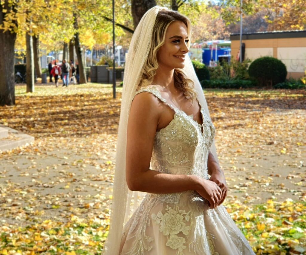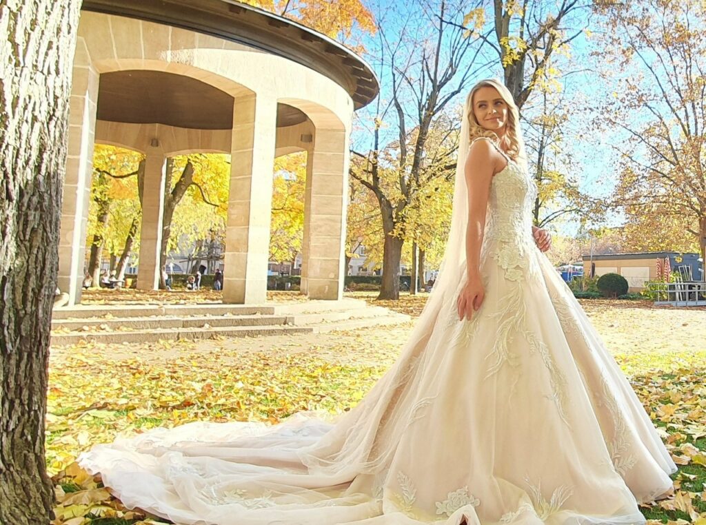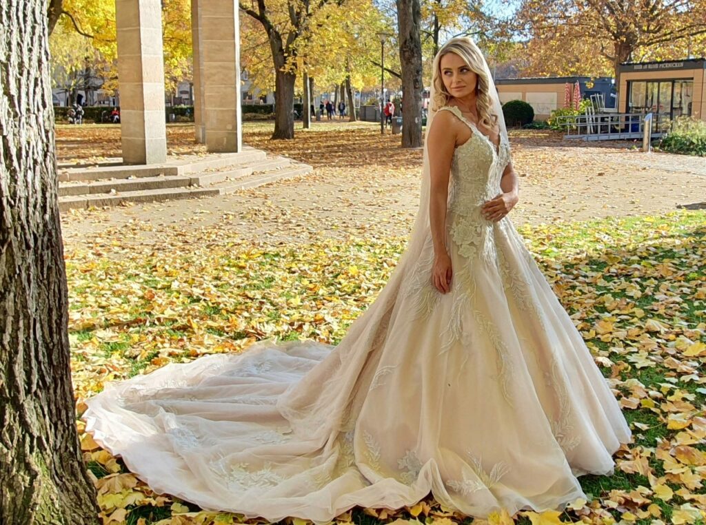 Besonders eindrucksvoll ist das Design des Kleides mit seiner floralen Struktur und den aufwendig gearbeiteten Stickereien, die dem gesamten Look eine elegante Tiefe verleihen. Die lange Schleppe wirkt wie eine Verlängerung deiner Bewegung, fast schwebend über dem herbstlich gefärbten Boden. Das Lichtspiel zwischen Stoff und Natur schafft eine Atmosphäre, die märchenhafter kaum sein könnte.